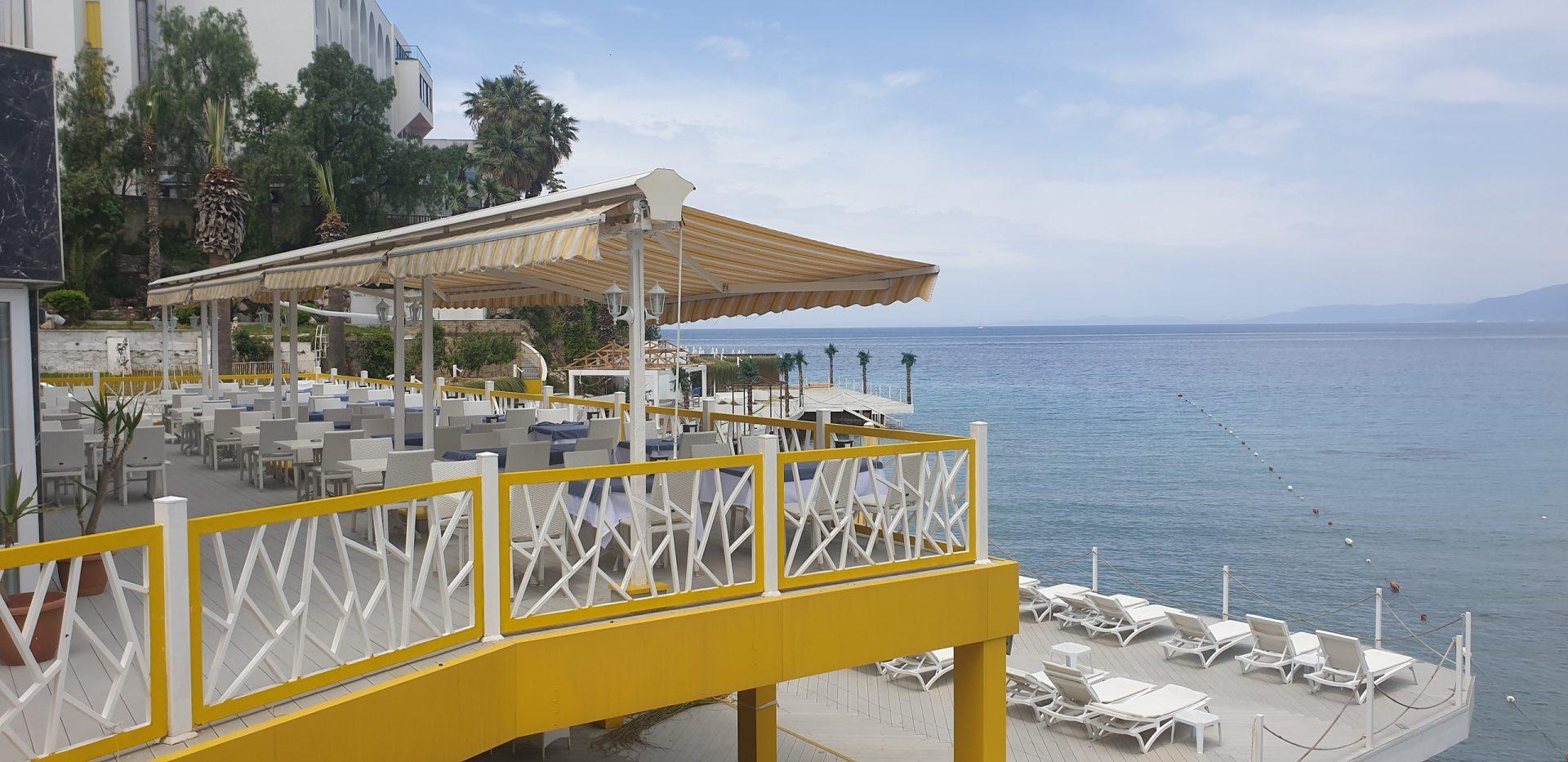 Kuşadası’nın en güzel plajı Tesisin önünde platform plajı mevcut olup, hemen yanında özel bir işletme mevcuttur. Bu plajda tüm hizmetler (şezlong- şemsiye-havlu-yeme içme) ücretlidir.